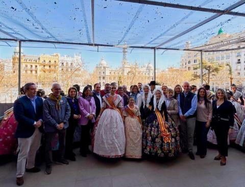 La presidenta de les Corts Valencianes, Llanos Massó, ha assistit a la Mascletá al Balcó de la Plaça de l'Ajuntament de València, disparada per la pirotècnia Tamarit, de la localitat valenciana d'Alfarrasí.