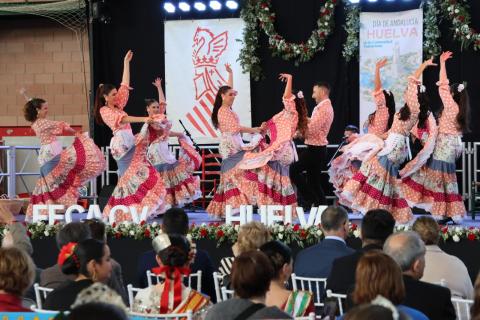 La presidenta de les Corts Valencianes, Llanos Massó, ha asistido al Día de Andalucía en la Comunitat Valenciana. Un evento lleno de fiesta, baile y color, que ha tenido lugar en el Pabellón Cubierto de Burjassot. Una edición que ha rendido homenaje a la provincia de Huelva.